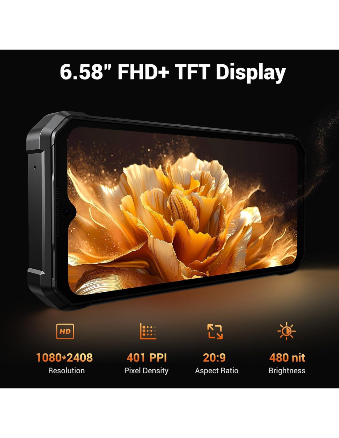 - Resistente al Agua & al Polvo & a Caídas: Este teléfono inteligente para exteriores cumple con los estándares IP68 & IP69K de resistencia al agua y MIL-STD-810H. Adopta diseños de neumáticos en las 4 esquinas, goma de alta resistencia para proporcionar una protección completa, la altura de caída anti-caída alcanza 1.5m, 360 contra el polvo. Tecnología de sellado avanzada, permite trabajar bajo el agua a una profundidad de 1.5m durante hasta 30 minutos para apoyar y acompañarte en cualquier trabajo o aventura al aire libre.