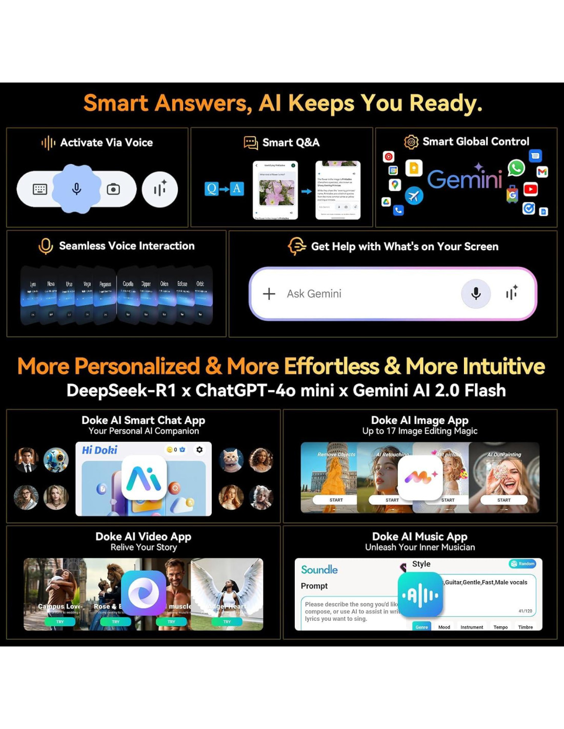 - Últimas características de Android 15 y Doke AI. El Blackview BL7000 funciona con Android 15 y Doke OS 4.1, ofreciendo una experiencia de usuario fluida, segura e intuitiva. Esta última versión mejora la protección de la privacidad con características como espacio privado y notificaciones sensibles. Además, la integración de capacidades de IA, como preguntas y respuestas inteligentes, chat de voz y texto predictivo, hace que el teléfono resistente 2025 no solo sea una herramienta de comunicación, sino también un asistente inteligente para tu vida diaria. Con Doke AI y Gemini 2.0 disponibles, puedes explorar características avanzadas de IA como edición de imágenes y videos, creación de música y más, ¡impulsando tu creatividad y productividad!