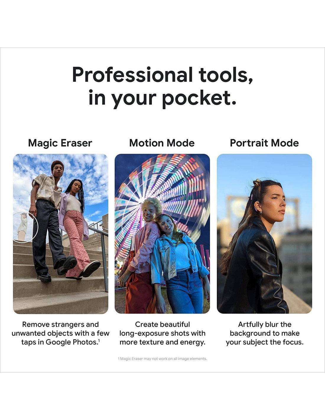 - Herramientas profesionales como Magic Eraser, Modo de Movimiento y Modo Retrato mantienen tus fotos nítidas, precisas y enfocadas