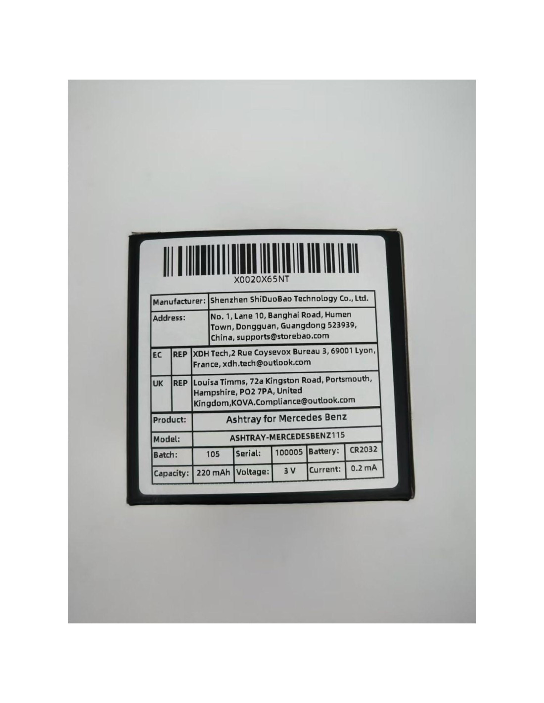 Cenicero de coche StoreBao para Mercedes-Benz Especificaciones Tamaño: 2.6"/67MM (ALTURA) x 3"/76MM (ANCHO SUPERIOR) x 3"/76MM (ANCHO INFERIOR) Peso: 7.4oz/210g Paquete 1 x Cenicero 1 x Batería extra (Maxell CR-2032, puede almacenarse durante 5 años).