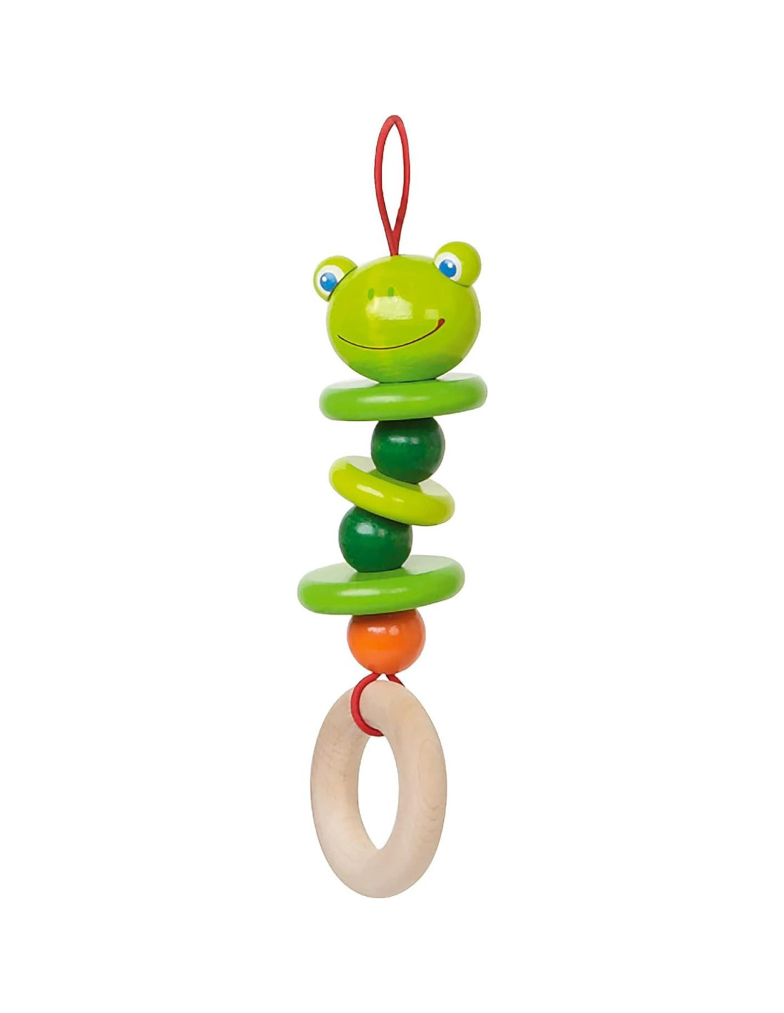- Click-clack. los discos de madera de colores en los lados golpean felizmente entre sí cuando se empujan de un lado a otro. Arriba, la encantadora rana cuelga de la barra de descubrimiento.