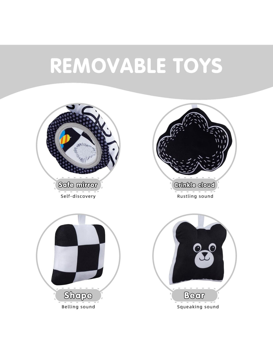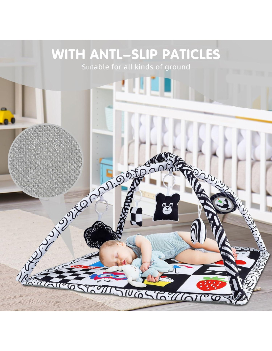 - Alfombra de Juego para Bebés en Blanco y Negro: Nuestra alfombra de juego para bebés en blanco y negro presenta colores primarios de alto contraste en rojo, azul y amarillo que ayudarán a su pequeño a desarrollar su retina, nervio óptico y cerebro. Incluye cinco juguetes colgantes que mejoran las habilidades visuales y perceptivas de su bebé. Perfecto para infantes y bebés de 0 a 6 meses.