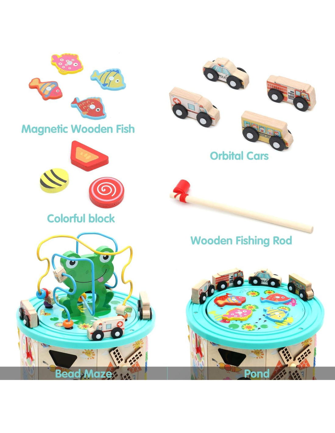 Material: Madera Accesorios: caña de pescar de madera * 1, pez de madera magnético * 1 paquete, cubos coloridos * 1, ajedrez volador * 1 paquete, vehículo orbital * 1 paquete Tamaño: 9.25 * 9.25 * 6.89 in / 23.5 * 23.5 * 17.5 cm Características Educativas: Lados: 1. Rompecabezas de Dinosaurios: Desarrolla la coordinación mano-ojo de los niños a través del movimiento de los deslizadores para restaurar el lindo dinosaurio. 2. Globo Aerostático: Construye la concepción del tiempo y el color a través del movimiento de los punteros. 3. Juego de Emparejamiento de Animales: Mejora la cognición de los niños sobre formas y animales a través del movimiento de los bloques de diferentes formas a sus agujeros correspondientes. 4. Molino de Viento Giratorio: Mejora las habilidades prácticas de los niños y su percepción de la velocidad. 5. Engranajes: Rota uno de los engranajes para mover otros y crear un fascinante efecto colorido. 6. Ábaco: Ayuda a mejorar las habilidades de los niños para distinguir colores, aprender números y conceptos básicos de matemáticas. 7. Juego de Ruleta: Rota la ruleta para emparejar las frutas y los números. Lados Superiores: 1. Laberinto de Perlas: Mueve las perlas de un extremo al otro. Una adorable rana se sienta en el medio observando. 2. Juego de Pesca: Disfruta de tu juego de pesca con los peces de madera y la caña de pescar incluidos. 3. Vehículos Orbitales: Mueve los vehículos a lo largo de las pistas circulares. Parte Inferior: Ajedrez de Aeroplano: Juega con las fichas y dados incluidos con 1 a 3 otros jugadores.