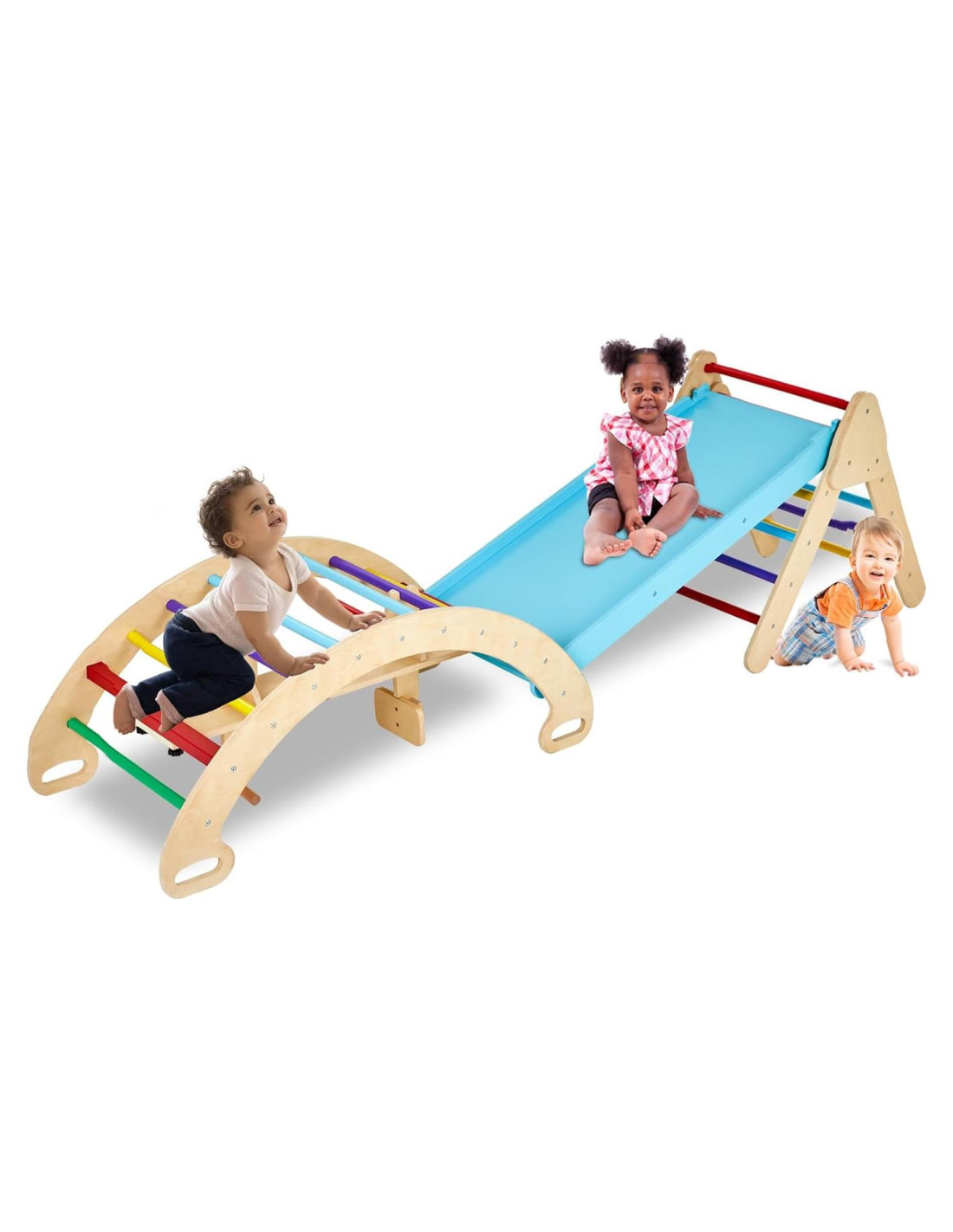 - Múltiples Modos de Juego: El conjunto de triángulo de escalada Pickler incluye arcos de escalada, rampas de doble cara y escalera triangular. Puedes combinar libremente o usar estas tres partes por separado para experimentar una variedad de diversión. El arco de escalada no solo se puede escalar, se puede usar como caballito de balancín, sino que también se puede acolchar para convertirse en una silla de balancín. Las rampas de doble cara permiten tanto deslizarse como escalar. El Triángulo de Escalada ofrece otra forma de escalar.