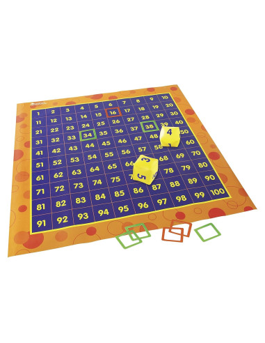 Versátil, de gran tamaño, versión cinestésica del familiar tablero de cientos. Refuerza conceptos de cientos, conteo, patrones numéricos, valor de lugar, operaciones, resolución de problemas y fluidez general en hechos numéricos. Los marcos de doble cara te permiten marcar o codificar por colores números como pares e impares. Incluye 2 cubos inflables para los números 1-6, 54 marcos de doble cara, guía de actividades y una manta fácil de limpiar que mide 1.22 m x 1.22 m (4 x 4). Para grados K y superiores. Edades 5+