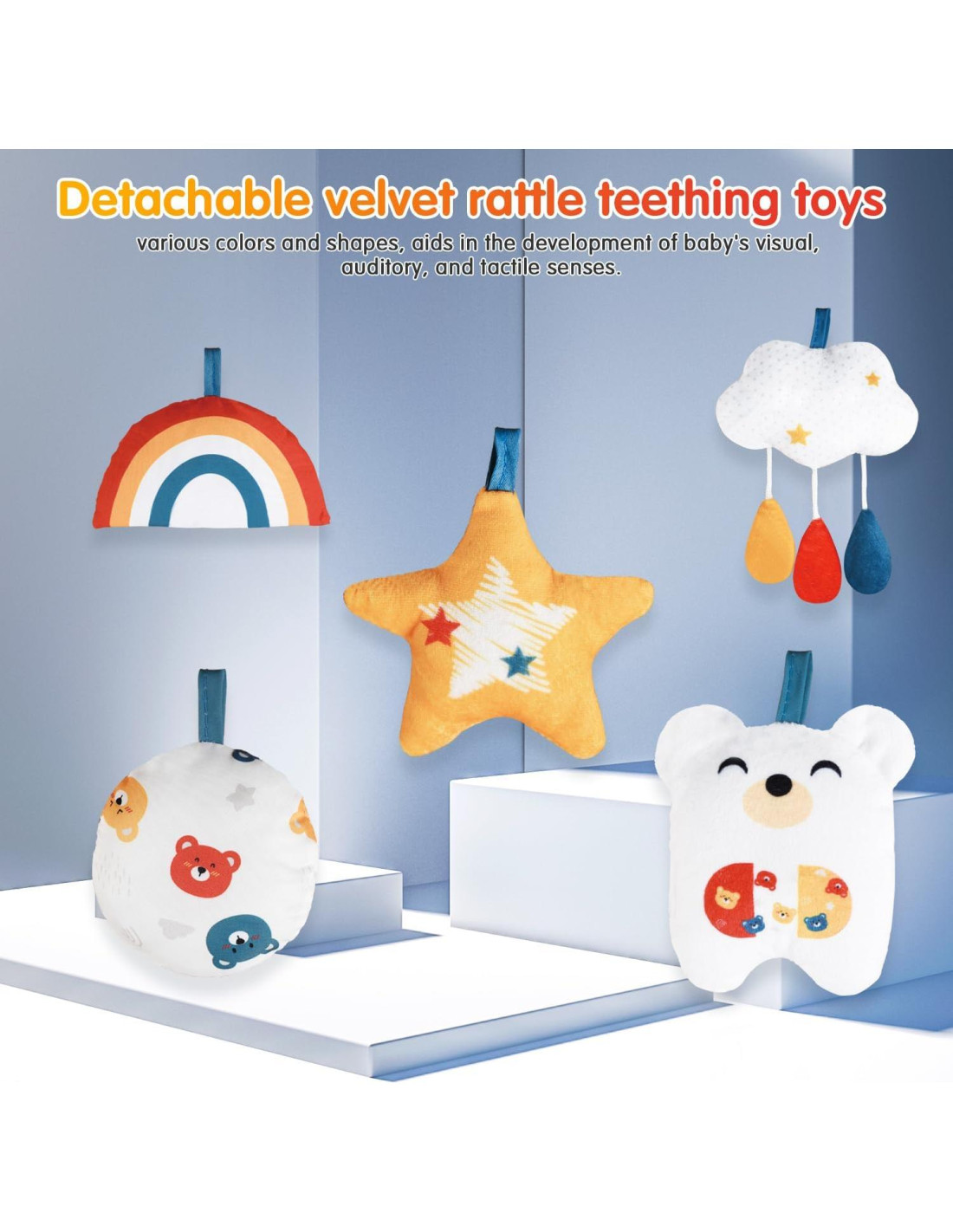- Alfombra de actividad para bebés con temática de oso que incluye 5 juguetes sonajeros desmontables que fomentan el seguimiento visual, la sujeción y la exploración sensorial, perfecta para el desarrollo de recién nacidos.