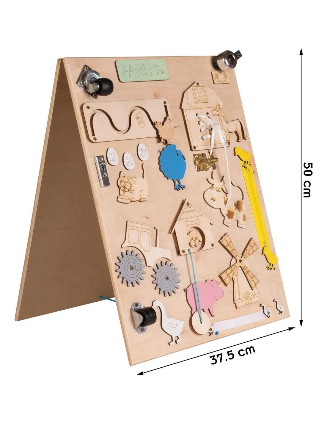 LEO Tablero de Actividades Sensoriales de Madera Tablero Ocupado de Pie Doble Lado Adecuado para Edades 3 y Más CARACTERÍSTICAS: Las manos pequeñas se verán atraídas por este tablero ocupado de madera de pie. Está compuesto por 2 lados de actividades: - En un lado, muchos elementos están fijos para que los curiosos pequeños prueben, descubran y desarrollen sus habilidades motoras de manera lúdica. - En el segundo lado, uno o más tableros se pueden usar con tizas, marcadores o bolígrafos donde los niños dejarán hablar su imaginación. Este tablero de actividades ofrece una amplia variedad de elementos para desarrollar habilidades sensoriales según el método Montessori. Este último fomenta el pensamiento creativo y desarrolla las habilidades motoras y la lógica de los niños. Muy práctico, esta pintura no necesita ser fijada a la pared. Se puede colocar en una versión abierta, como un tablero de pie, o en una versión cerrada, acostada, con un lado accesible. Cada tablero está hecho de madera, con un tema determinado, y ofrece juegos educativos con formas divertidas y colores claros y pasteles. La concentración, coordinación, habilidades manuales y destreza de los pequeños serán solicitadas. Hecho en Europa. ACTIVIDADES PROPUESTAS: Ruedas móviles y giratorias, pestillos de bloqueo, camino con movimiento, cierre de cremallera, timbre, números, letras, velcro, engranajes en formas de animales, cordones, espejo, interruptor, enchufe, reloj, laberinto, hebilla con correa, tablero de tiza, pizarra blanca magnética, tablet mágica con stylus. Algunas actividades se relacionan con ciertos modelos. DIMENSIONES Y PESO: Modelo mediano: Longitud 37.5 x Altura 50 cm. Peso: 3.4kg Grande: Longitud 50 x Altura