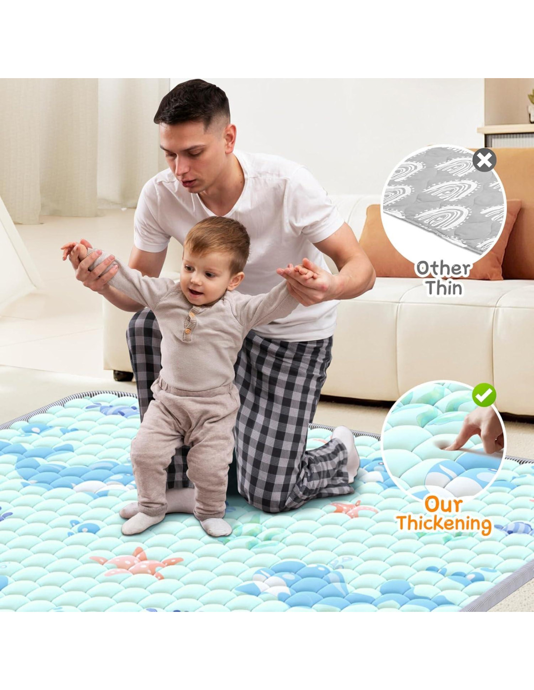 - Conveniente de Plegar y Fácil de Limpiar Con un diseño de una sola pieza, esta alfombra es fácil de plegar y almacenar, por lo que puedes llevarla contigo fácilmente ya sea que estés en casa o en movimiento. Soporta lavado a máquina y es muy fácil de limpiar, sin necesidad de preocuparse por manchas de leche, jugo, orina, etc. Costuras precisas y reforzadas aseguran que la alfombra mantenga su forma original después de muchos lavados, proporcionando un espacio de juego ordenado y seguro para tu bebé.