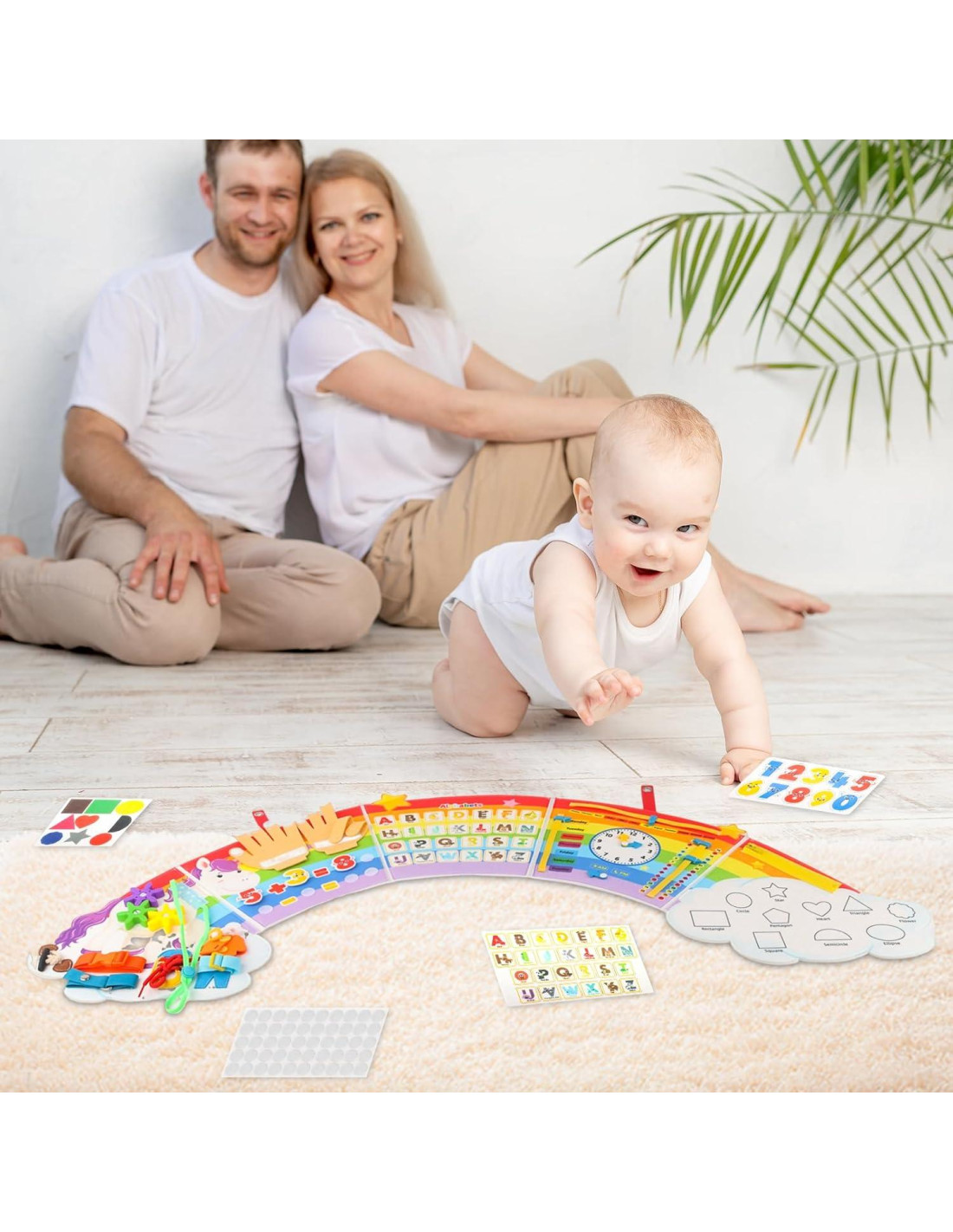 - APRENDIENDO MIENTRAS JUEGA: El panel sensorial para niños permite a los bebés mejorar habilidades de vida, habilidades motoras finas, habilidades para resolver problemas, pensamiento lógico y coordinación mano-ojo, y mejorar la cognición y creatividad sobre el tiempo, números, frutas, colores, formas geométricas, etc. durante el entretenimiento.