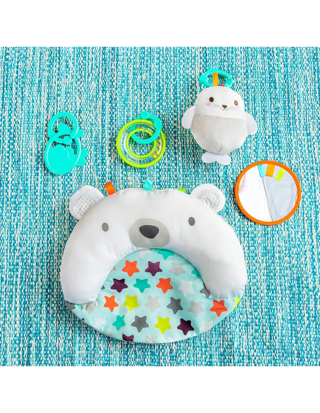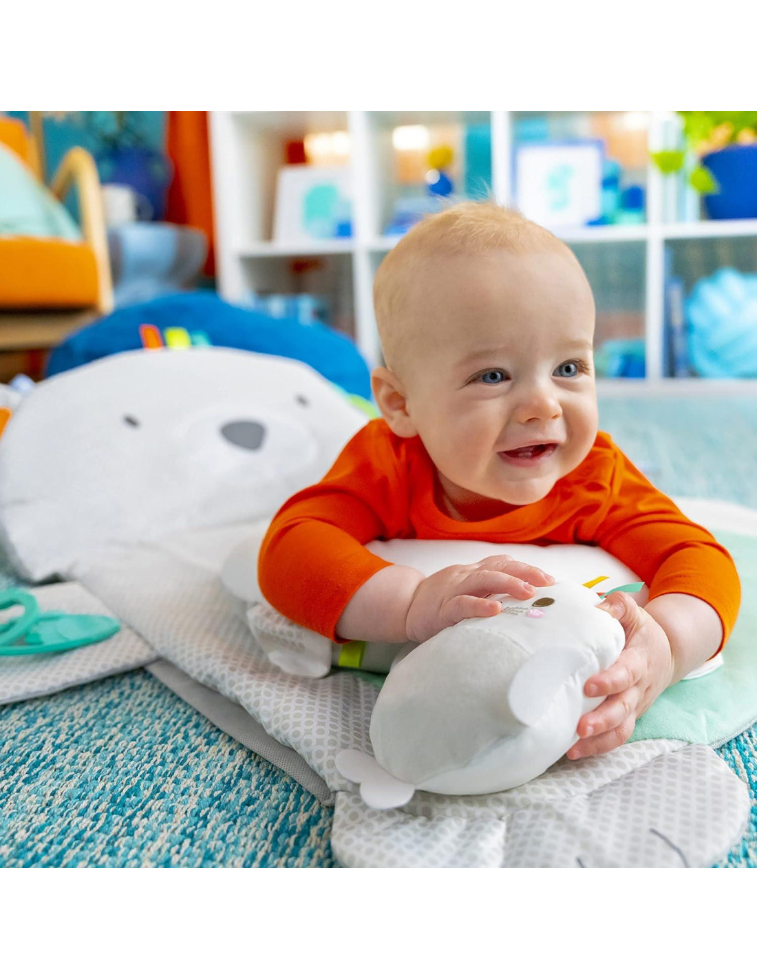 Cada bebé necesita un lugar para jugar. Con la alfombra Bright Starts Tummy Time Prop & Play, tu pequeño osezno tendrá el espacio más acogedor para hacerlo. Suave y acolchada, esta alfombra de oso polar ofrece soporte para todos los movimientos y patadas de tu bebé. La dulce almohada de soporte a juego le da un impulso al bebé mientras aprende a levantarse durante esos primeros meses. Pequeños lazos de satén Taggies rodeando la alfombra de juego brindarán a tu bebé entretenimiento y comodidad adicionales. El bebé también puede explorar sonidos crujientes, sonajeros y otros accesorios de juguetes. Haz que el tiempo boca abajo sea aún más fácil levantando la cabeza del oso polar para acercar los juguetes. Las patas levantadas cuentan con un espejo seguro para bebés que involucra al bebé y fomenta los movimientos de cabeza de izquierda a derecha. Hecha para adaptarse bien en espacios pequeños, puedes llevar esta alfombra contigo al viajar para mayor comodidad dondequiera que estés.
