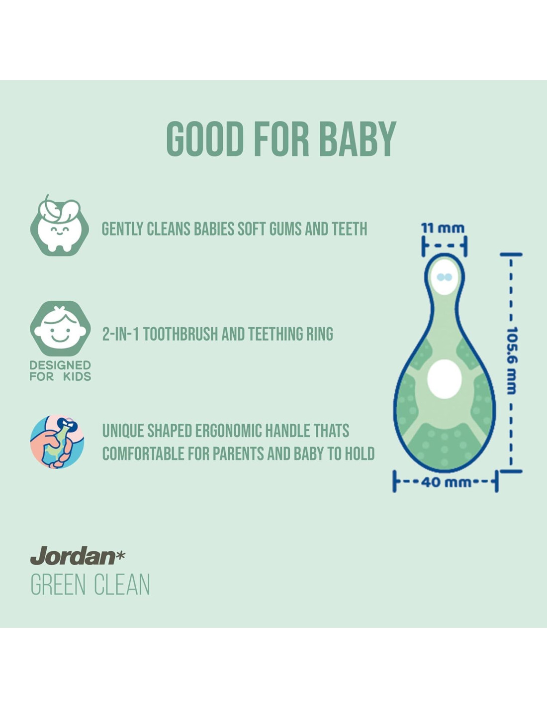 - ANILLO DE MORDIDA SUAVE PARA BEBÉS EN DENTICIÓN - Desarrollado pensando en los bebés y el planeta, el cepillo de dientes Jordan Green Clean ayuda a dar el primer paso para establecer rutinas de cuidado dental saludables y felices para toda la vida
