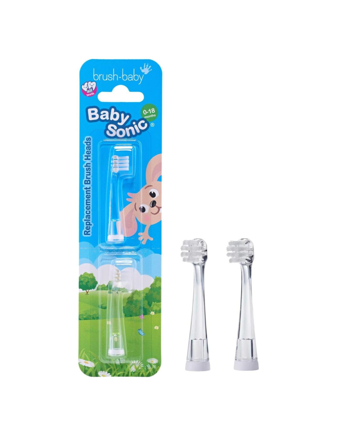 Descripción del Producto. Las cabezas de repuesto para el cepillo de dientes BabySonic están diseñadas perfectamente para cuidar las bocas pequeñas. La pequeña cabeza del cepillo y las suaves cerdas son gentiles con los nuevos dientes de bebé y las encías adoloridas por la dentición. Adecuado desde el nacimiento, el BabySonic está diseñado para crecer con tu bebé, ofreciendo una selección de cabezas de cepillo de tamaño infantil y de tamaño para niños pequeños. ¡Solo reemplaza la cabeza del cepillo para seguir usando el BabySonic hasta que cumplan 3 años! La cabeza de cepillo de repuesto para bebés es adecuada desde 0 hasta 18 meses y tiene una pequeña cabeza de cepillo para bocas pequeñas. También está disponible una cabeza de cepillo de repuesto para niños pequeños adecuada desde 18 hasta 36 meses. Reemplaza las cabezas de cepillo cuando estén desgastadas o abiertas, después de una enfermedad, o al menos cada 3 meses. Las cabezas de cepillo de repuesto están disponibles en Amazon; usa solo cabezas de repuesto BabySonic de Brush-Baby. No compatible con los cepillos de dientes Brush-Baby Go-Kidz o KidzSonic. Duradero y resistente, libre de BPA y probado según los estándares de la UE. Materiales de embalaje - PET/Cartón - ampliamente reciclables. Materiales del producto - Plástico ABS - reciclable. Cerdas de nylon - actualmente no reciclables. INSTRUCCIONES. Siempre supervisa a tu hijo durante el cepillado. Intenta cepillar al menos dos veces al día, durante 2 minutos. Para usar, humedece las cerdas y aplica una pequeña cantidad de pasta de dientes Brush-Baby. Anima a tu pequeño a escupir la pasta de dientes después de cepillarse, pero no enjuagues. Para limpiar, enjuaga la cabeza del cepillo con agua y deja secar. Revisa las cerdas antes de cada uso y reemplaza la cabeza del cepillo si está dañada o cuando las cerdas se desgasten. Las cabezas de cepillo deben ser reemplazadas como mínimo cada 3 meses y después de una enfermedad, para evitar reinfecciones. El conjunto contiene: 1 Paquete de 2 Cabezas de Cepillo de Dientes Eléctrico Babysonic 0-18 Meses.