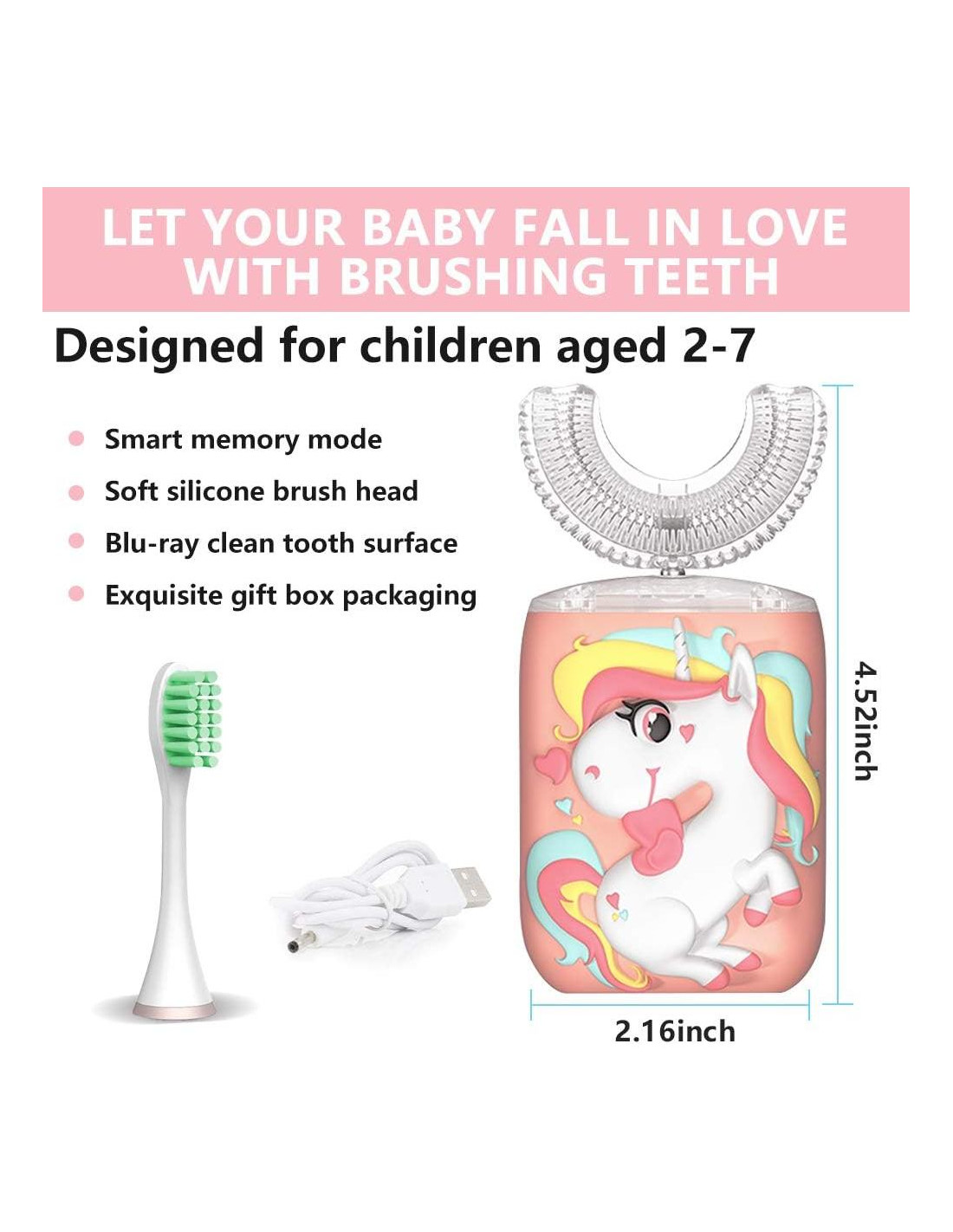 - CABEZAL DE CEPILLO EN FORMA DE U: El cabezal de cepillo en forma de U, hecho de silicona de grado alimenticio, es muy suave, especialmente diseñado para las encías tiernas de los niños y dientes sensibles. Se proporciona un cabezal de cepillo adicional, que puede recortarse según sea necesario.