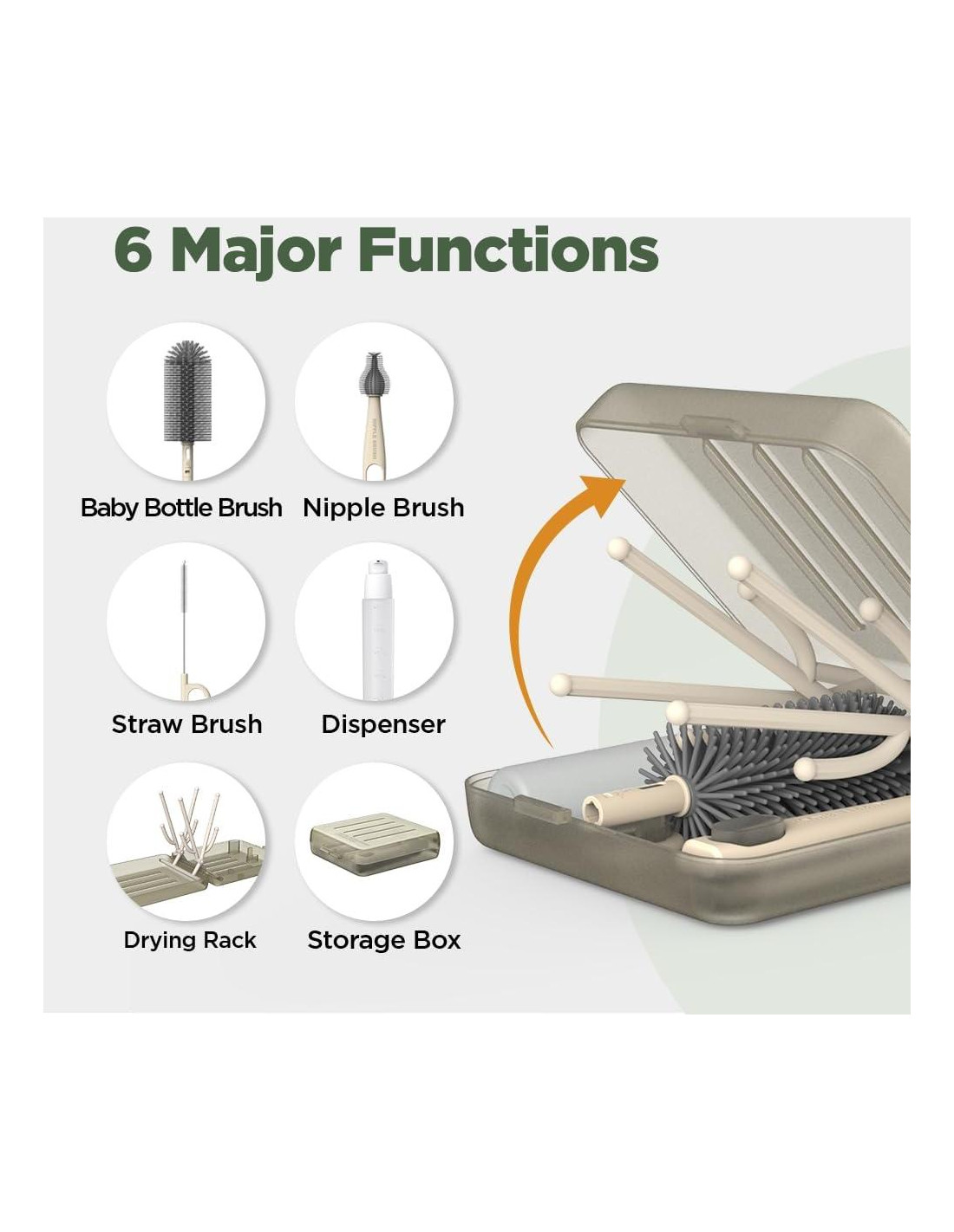 - [Kit de Limpieza de Botellas de Viaje 6-en-1] Este conjunto todo en uno incluye un cepillo para botellas, un cepillo para pezones, un cepillo para popotes, un dispensador de jabón, un soporte portátil para secado de botellas y un estuche de almacenamiento-todo lo que necesitas para limpiar botellas mientras viajas con el bebé.