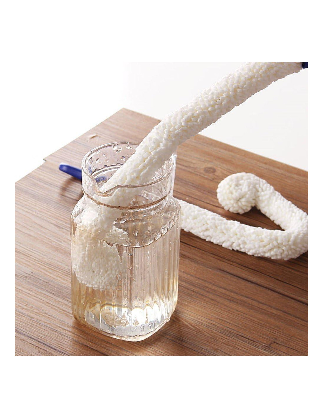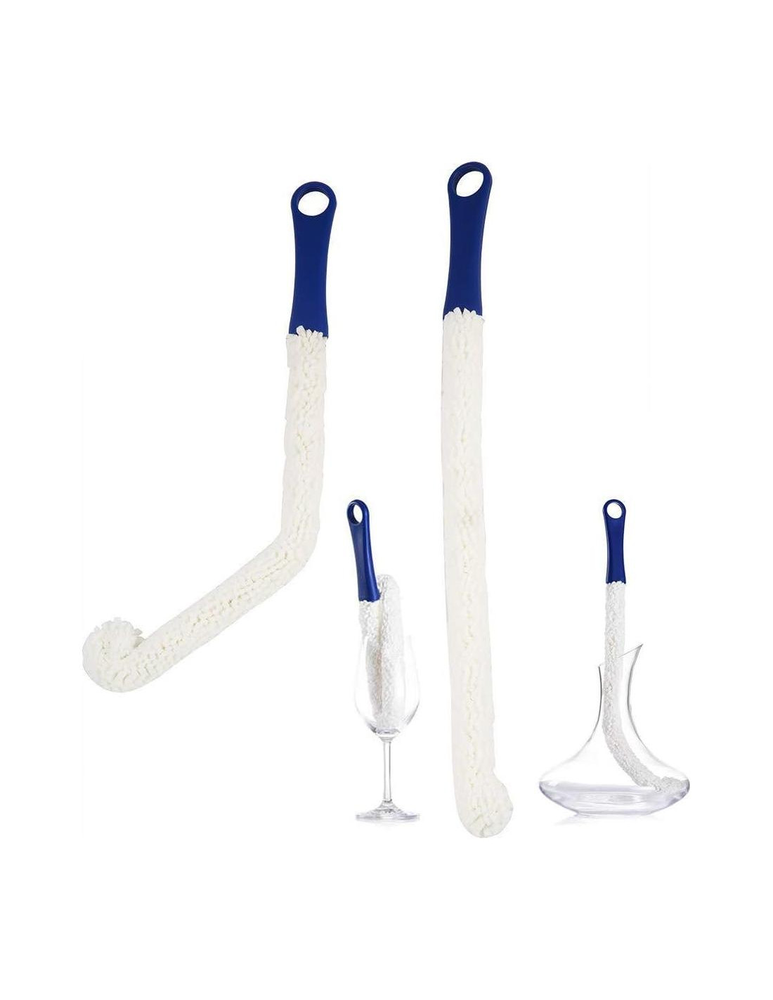 DISEÑO ÚNICO--. Cepillo flexible, de dureza media y con cabeza en forma de puño. Se puede doblar libremente para adaptarse a cualquier recipiente doméstico. ALTA CALIDAD-- Ligero y lo suficientemente largo para limpiar el polvo y la suciedad en el fondo del vaso. REUTILIZABLE--- Fácil de llevar y usar. Doblado libre y reutilizable, almacenamiento conveniente y ahorro de espacio. VENTAJA-- Cabeza de cepillo de esponja gruesa, elimina la cal, no daña la pared interior de la taza. Color: Mango azul y espuma blanca. Tamaño: Longitud: 1 pieza 16 pulgadas (Aproximadamente 42 cm), 1 pieza 18 pulgadas (Aproximadamente 46 cm). Empaque: Total de dos. Flexible, suave, ligero, reutilizable, lo suficientemente largo para limpiar el polvo y la suciedad en el fondo del vaso. Ideal para la limpieza de decantadores de vino, copas, vasos, tazas, etc. ¡Disfruta de una cocina limpia y saludable y protege tus costosos vasos!