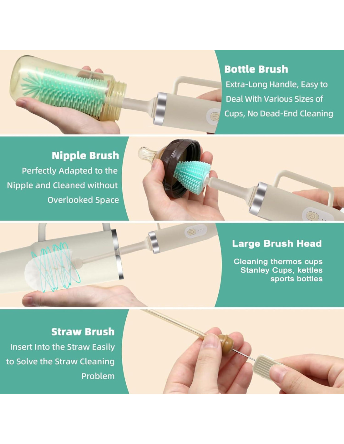 - [Equipado con 4 Cabezas de Cepillo, Fácil de Manejar en una Vida Ocupada] Incluimos 4 cabezas de cepillo (incluyendo cepillo de limpieza universal, cepillo para botellas, cepillo para chupetes, cepillo para limpiar pajitas), desde botellas de agua, biberones, tazas de café hasta Tazas Stanley de 64 onzas, este cepillo eléctrico puede manejarlo fácilmente.