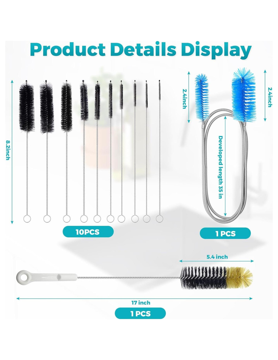 - 12 PCS cepillo de limpieza reutilizable: 1pcs x cepillo antiestático de mango largo de 43.2 cm, 10pcs x cepillos de limpieza de tubo de nylon de 20.8 cm de diferentes diámetros, 1pcs x cepillo flexible de doble extremo de 88.9 cm