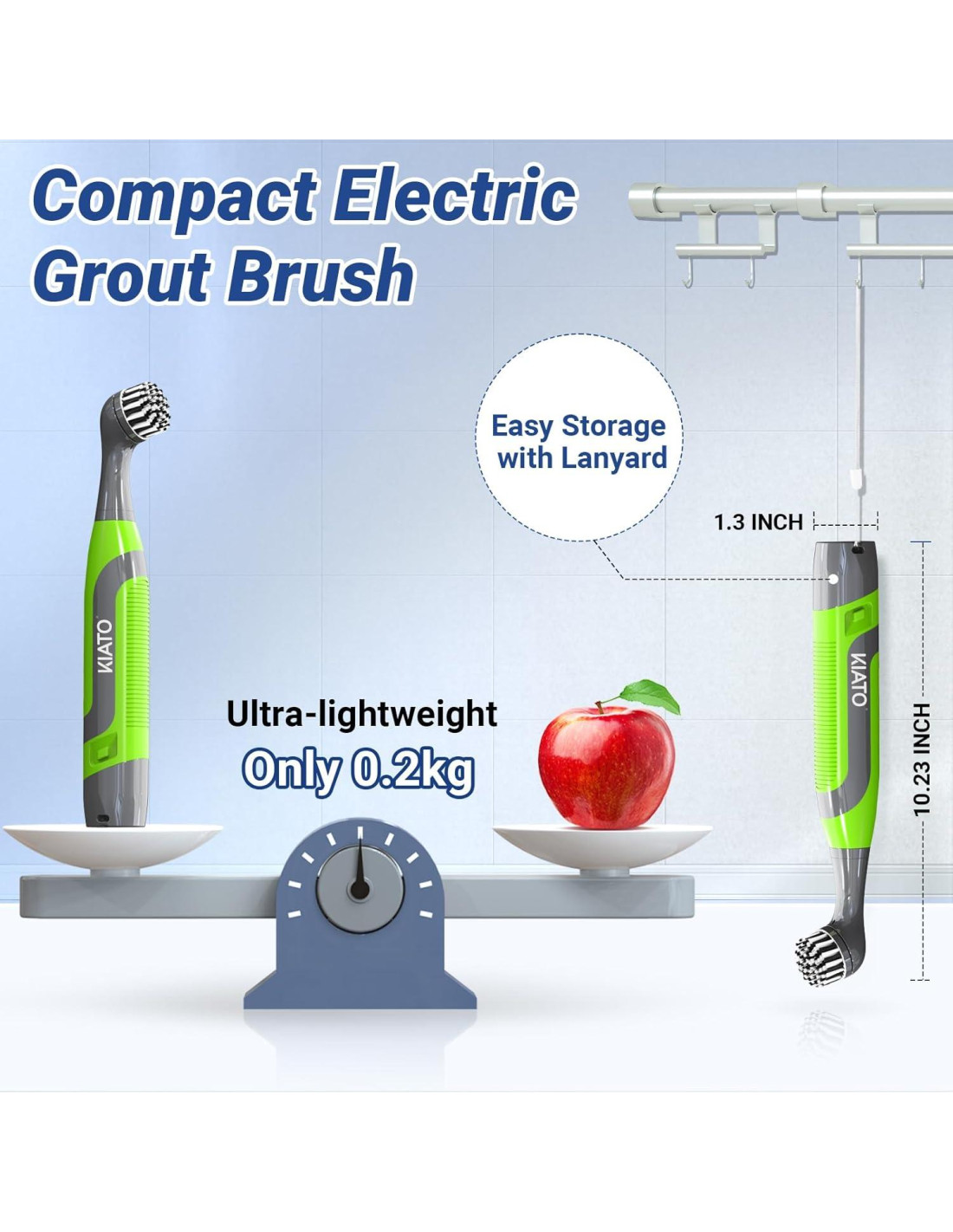 - El cepillo de lechada eléctrico mini Kiato mide 28 centímetros de altura y pesa solo 0.2 kilogramos, lo que lo hace del mismo tamaño que un cepillo de dientes eléctrico. Su cabezal de cepillo más grande, cerdas más rígidas y varios accesorios hechos especialmente para rincones y grietas lo diferencian de un cepillo de dientes eléctrico.