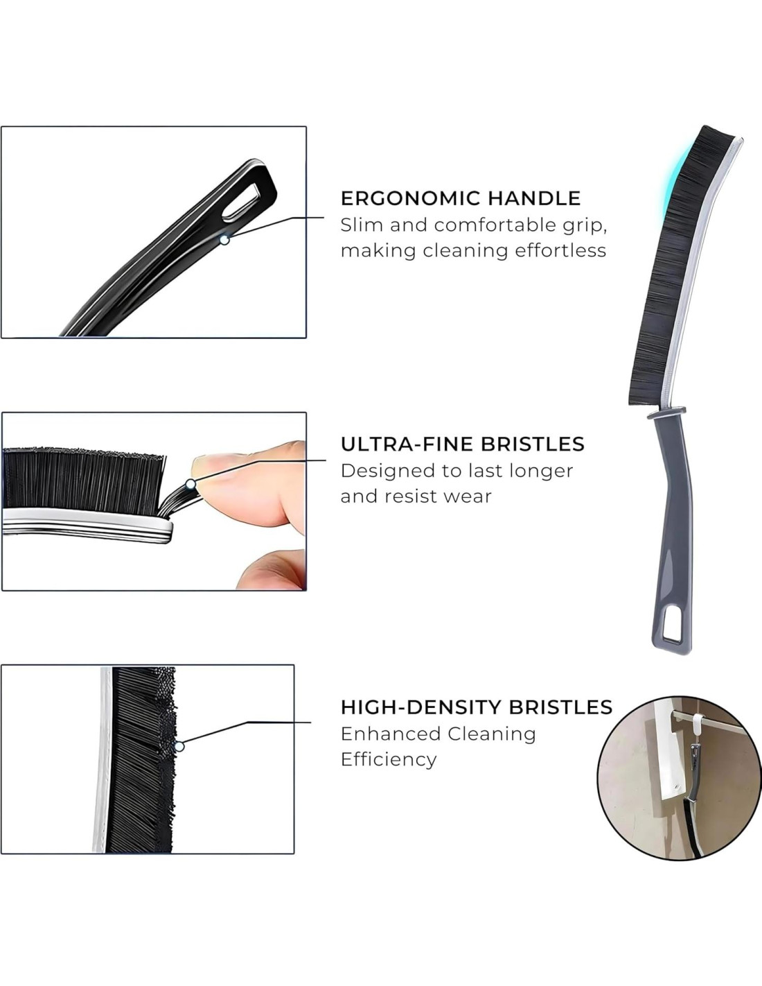 - Cepillos de Limpieza de Grietas Multifuncionales: Estos cepillos de limpieza de grietas son adecuados para limpiar varios huecos, como huecos de ventanas, huecos de piso, huecos de cocina, huecos de baño, huecos de automóvil y otros huecos. Son una herramienta esencial para la limpieza del hogar.
