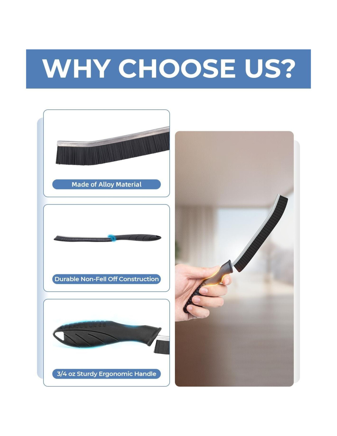- Limpieza eficiente: Cabeza estrecha y diseño curvado en la parte delantera, puede entrar fácilmente en huecos, grietas, esquinas y áreas de difícil acceso, cerdas gruesas y largas pueden eliminar eficazmente el polvo, los desechos y la suciedad en espacios pequeños.