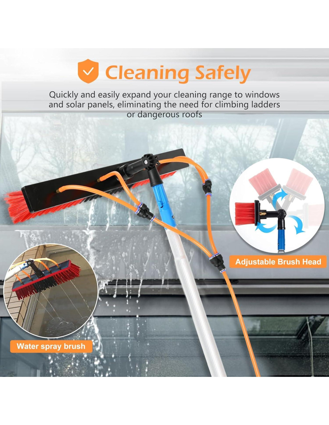 - Amplias aplicaciones: La herramienta limpiadora de paneles solares telescópica es adecuada para limpiar ventanas de gran altura, limpiar revestimientos de casas, limpiar paneles solares fotovoltaicos, coches, camiones, furgonetas, caravanas, pisos de garajes, invernaderos, techos de conservatorios, terrazas, etc. Los accesorios se pueden usar con una variedad de herramientas de limpieza para realizar un proceso de limpieza avanzado.