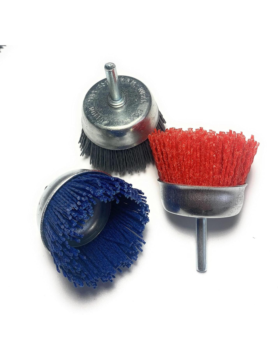- Cepillos abrasivos de copa y ruedas de nylon montados en vástagos de 1/4 de pulgada, se adapta a cualquier taladro o destornillador de impacto, RPM máxima: 4,500.