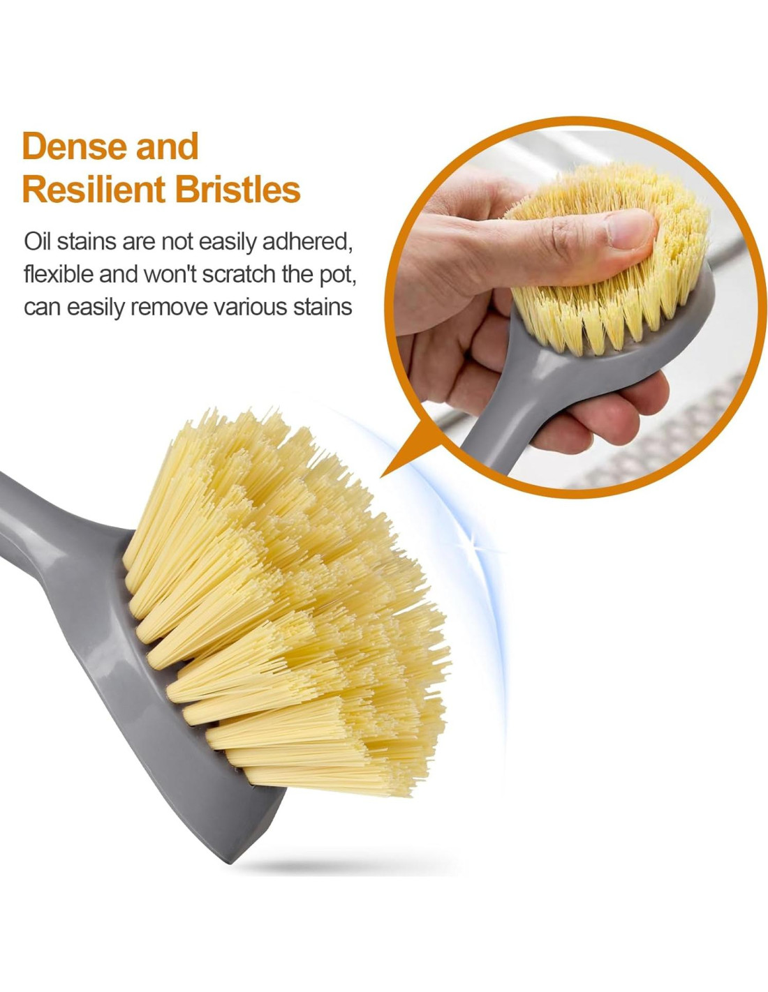 - Cerdas de Alta Densidad: La cabeza del cepillo cuenta con cerdas duraderas y de alta densidad que eliminan eficazmente la grasa y la suciedad sin rayar las superficies