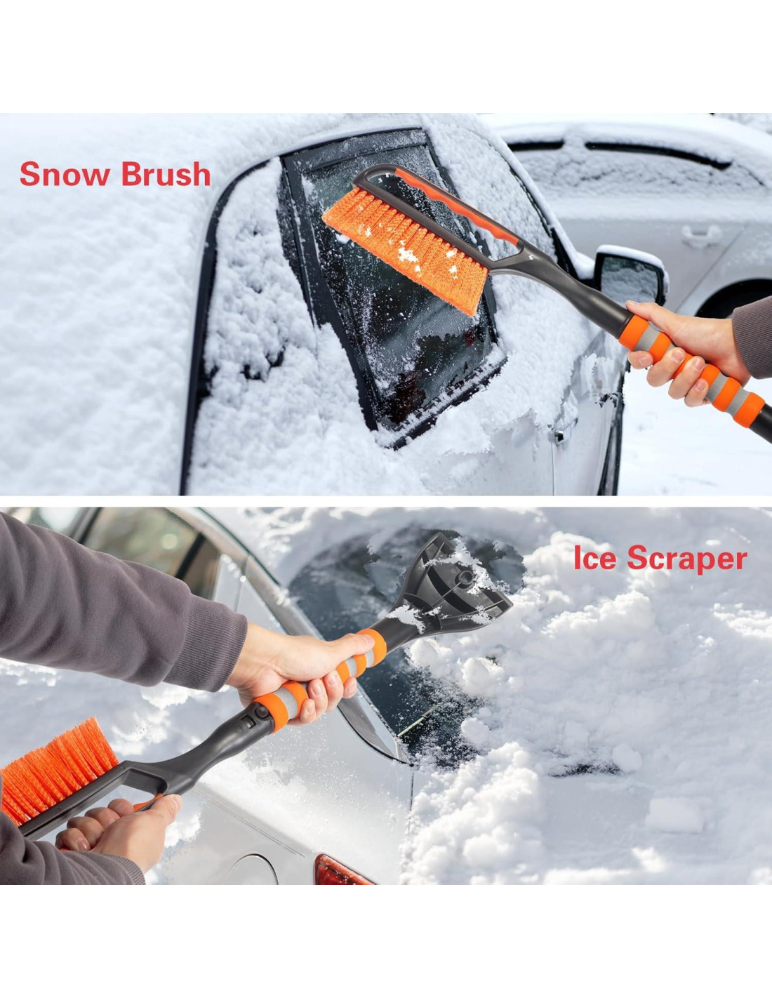 - Fácil de Usar y Almacenar: Presiona el broche de las juntas para desmontar o montar rápidamente el cepillo de nieve y el raspador de hielo, conveniente y rápido, puedes guardarlo en el maletero de tu coche. El raspador de hielo y el cepillo de nieve también se pueden usar por separado.