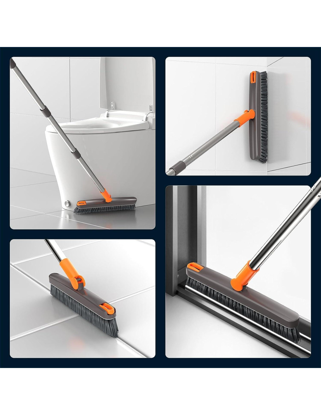 - Mango de acero inoxidable ajustable - El cepillo de fregado para el suelo viene con 4 secciones de postes de acero inoxidable. El diseño ergonómico del mango telescópico largo ahorra tu espalda y rodillas, ya no más arrodillarte para fregar con un cepillo pequeño. Puedes ajustar la longitud del mango de 16.5" (41.91 cm) a 50" (127 cm) añadiendo o quitando la cantidad de postes