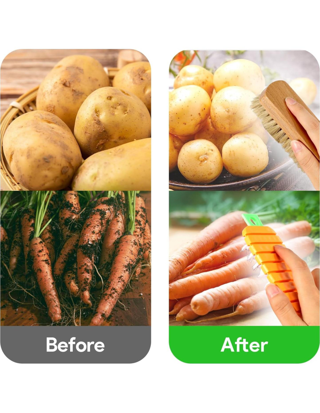 - Herramienta de Limpieza Multifuncional: El Cepillo para Verduras se puede usar no solo para limpiar papas, zanahorias y frutas, sino también para limpiar platos y otros utensilios de cocina. Una herramienta de cepillo se puede usar múltiples veces para proporcionar un soporte de limpieza efectivo para tu cocina.
