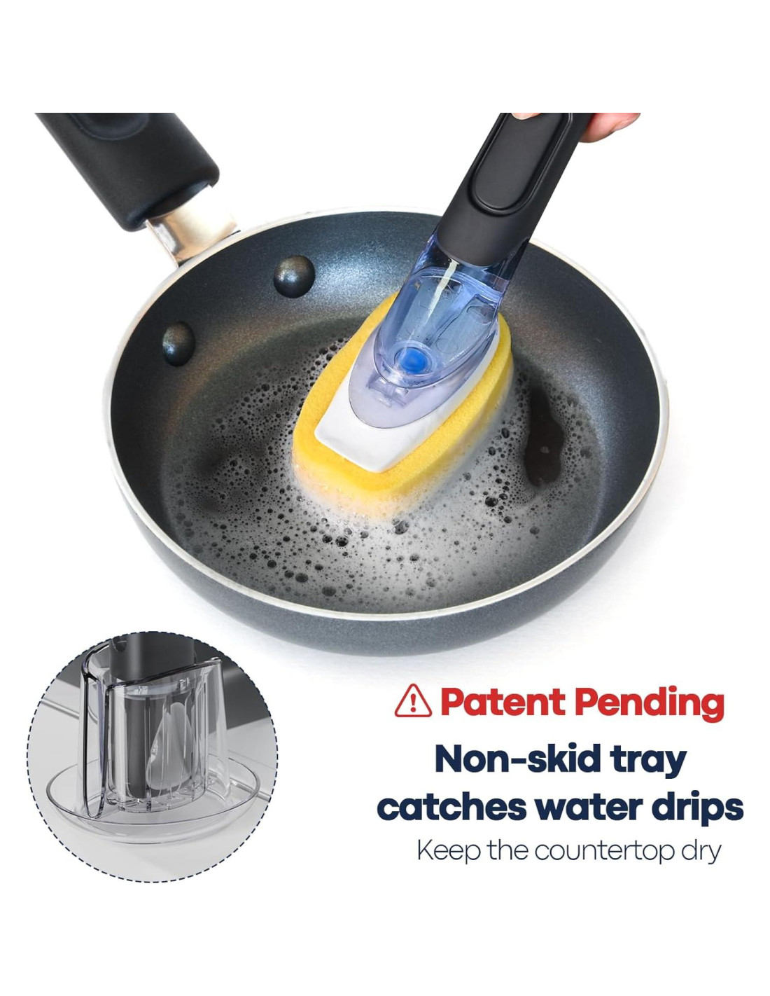 - 2 recargas de cepillo de esponja de repuesto: 2 cabezales de cepillo de repuesto se pueden reemplazar fácilmente con nuevos cabezales de cepillo. La cabeza de esponja es duradera y desinfectante, segura para todos los platos y utensilios de cocina (Por favor, consulte ASIN B0DHRPRCXW para ordenar recargas de cepillo de repuesto.)