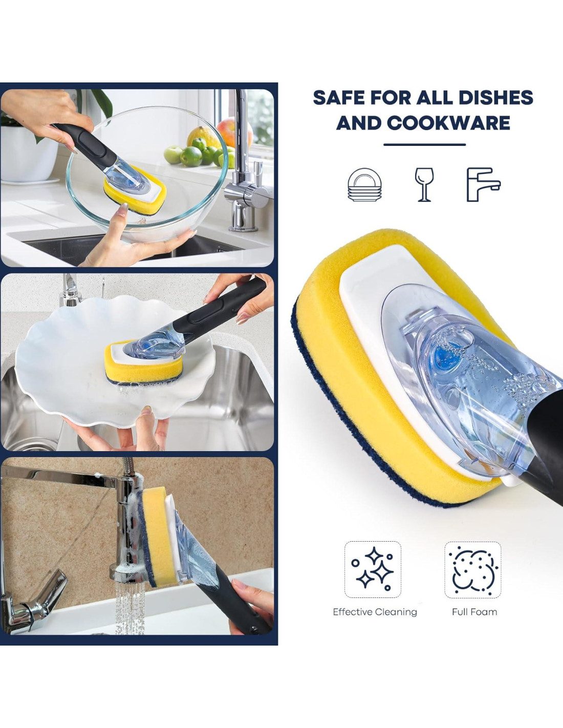 - Diseño de raspador trasero: El sujetador de raspador trasero y la esponja son fuertes y pegajosos, robustos y no se caen fácilmente. Nuestra esponja con mango de dispensador de jabón elimina fácilmente los alimentos pegados en los platos