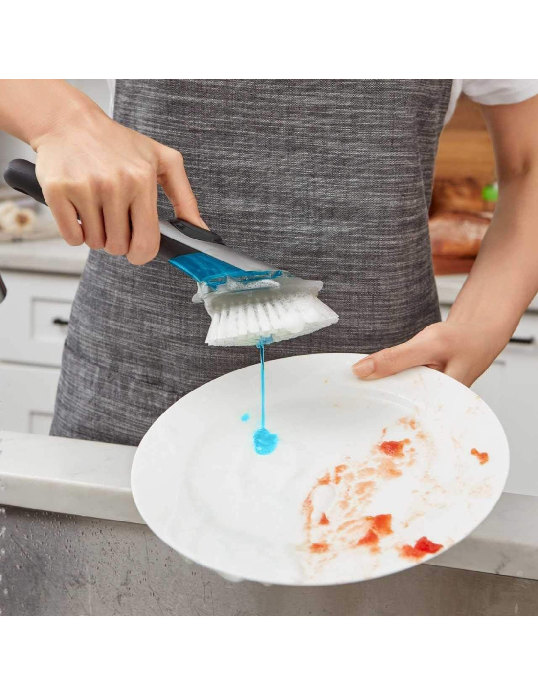 Descripción del Producto El Cepillo de Platos con Dispensador de Jabón OXO SteeL combina un cepillo de mango largo con jabón líquido para platos para una limpieza conveniente. El botón suave también actúa como un sello; simplemente tira del sello para llenar el cuerpo transparente con jabón. Vuelve a sellar la abertura, ¡estás listo para dispensar jabón con solo presionar un botón! El agarre suave es cómodo de sostener y es antideslizante, incluso cuando está mojado. Las cerdas de nylon duraderas eliminan fácilmente los alimentos pegados y son seguras para utensilios de cocina antiadherentes. Cuando sea el momento de un nuevo cabezal de cepillo, simplemente presiona hacia arriba en la pestaña para reemplazarlo. Adjunta el nuevo cabezal de cepillo deslizándolo. Las cerdas de nylon duraderas eliminan fácilmente los alimentos pegados y son seguras para utensilios de cocina antiadherentes. Los cabezales de cepillo de repuesto vienen en un paquete de dos para mayor comodidad e incluyen instrucciones. Esponja, cepillo o cabezales de fregado de repuesto se venden por separado. Dimensiones: 10.5 pulgadas (26,67 cm) x 4 pulgadas (10,16 cm) x 1.75 pulgadas (4,45 cm). Historia de la Marca OXO