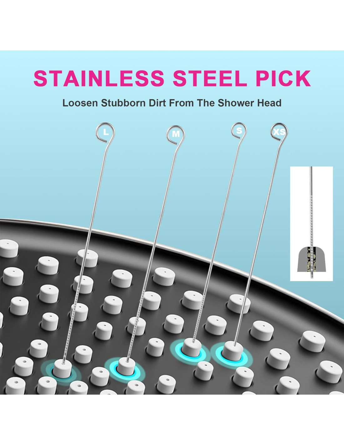 - 10 Puntas Limpiadoras de Múltiples Tamaños: Puntas de múltiples tamaños para adaptarse a varios agujeros pequeños de los cabezales de ducha. Los cepillos de acero inoxidable despejan fácilmente el camino del calcio incrustado en los pequeños agujeros del cabezal de ducha.