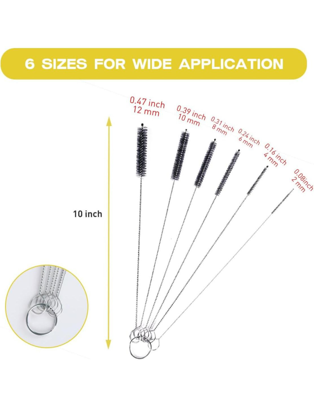 - Combinación de Tamaños Múltiples: El Juego de Cepillos de Limpieza incluye 6 piezas de 10" (25.4 cm) de longitud con diámetros diferentes de 2 mm, 4 mm, 6 mm, 8 mm, 10 mm, 12 mm, alcanzando toda la superficie interior de las pajitas y tuberías para una limpieza a fondo