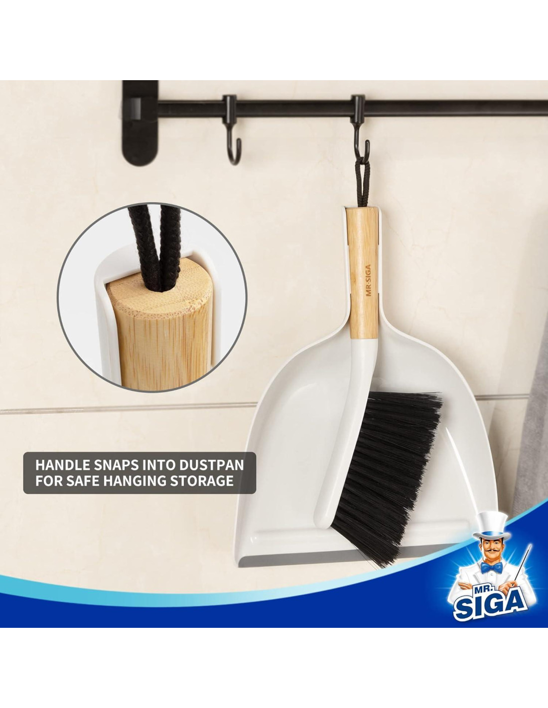 - Diseño elegante y compacto. El conjunto de recogedor y cepillo de mano MR.SIGA tiene un mango de bambú natural, su diseño portátil lo hace fácil de llevar y almacenar, ideal para limpiezas rápidas en cualquier lugar del hogar o la oficina. Mide 30 cm x 23 cm.