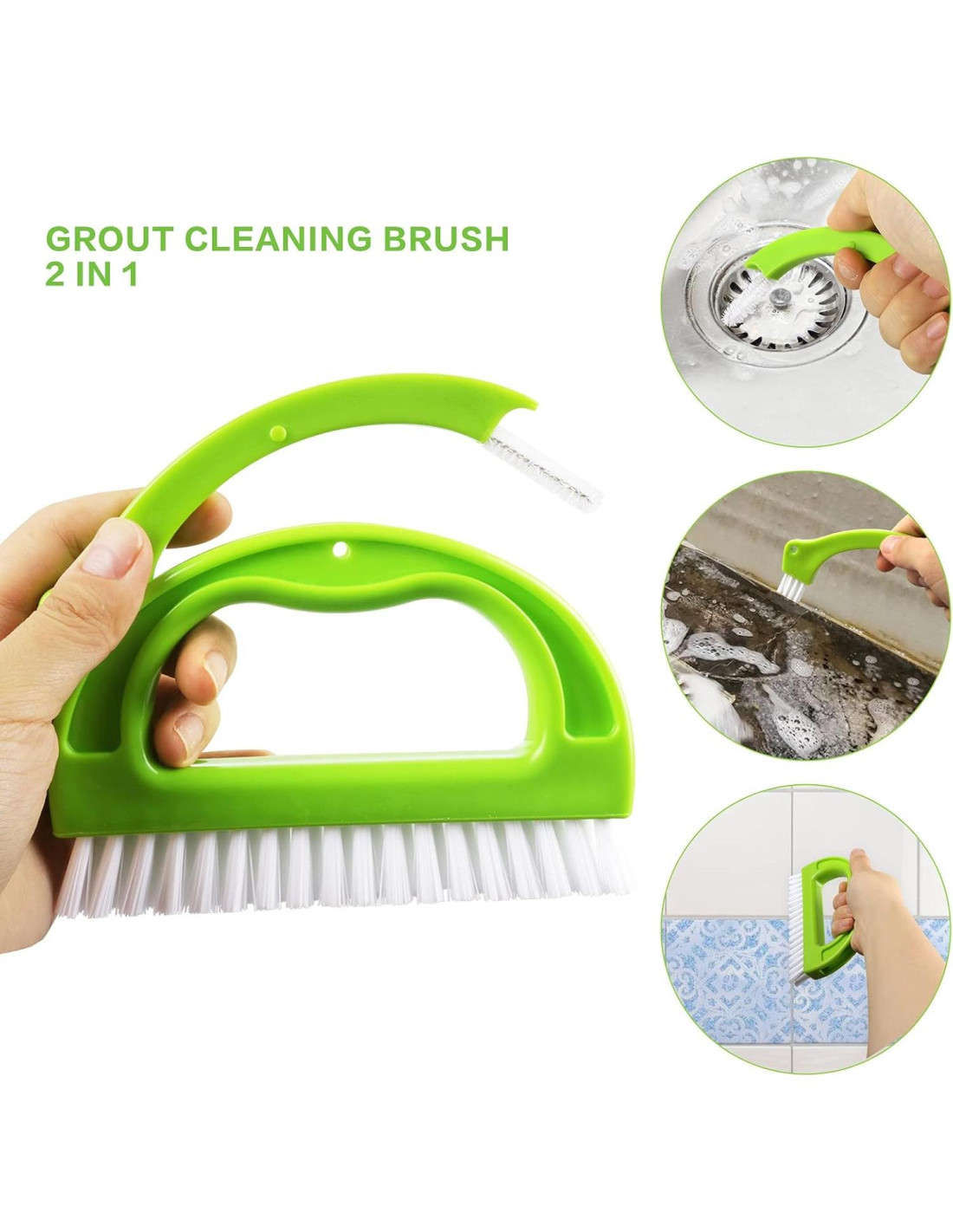 - Cepillos de Azulejos 3 en 1: (Limpiador de Líneas de Azulejos Grande) para juntas, azulejos de unión, bañeras, cuartos de servicio o limpieza de suelos. (Cepillo Largo) es el especialista para azulejos de pared, rieles, marcos de ventanas. (Cepillo Curvado) para dinteles de puertas de ducha, desagües de fregaderos, cocinas y diales. El pequeño cepillo curvado se anida en el cepillo grande.