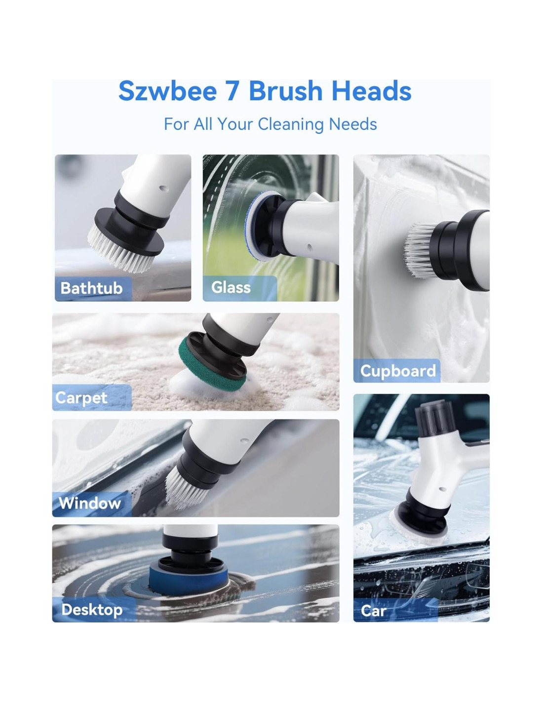 El Cepillo Eléctrico de 8 Generación Szwbee está diseñado por diseñadores con sede en Nueva York y respaldado por una patente de EE. UU. Confiado por más de 6.5 millones de clientes en todo el mundo, está construido para mejorar la eficiencia de limpieza y satisfacer las necesidades de aquellos con movilidad limitada. ¡Sí! El mango largo ajustable te permite limpiar sin doblarte ni arrodillarte. Ligero y fácil de usar para personas mayores o cualquier persona con movilidad limitada. Sí, es impermeable IPX7. Seguro para usar en duchas, bañeras y alrededor del agua. Limpia bañeras, azulejos, lechada, duchas, fregaderos, inodoros, ventanas, paredes, pisos y más. Genial para todas las superficies de baño y cocina con múltiples cabezales de cepillo incluidos. ¡Sí! El diseño de encastre permite un cambio rápido. Solo enjuaga con agua después de usar. Hecho de nylon duradero y construido para durar miles de usos. Hasta 90-120 minutos por carga, dependiendo de la velocidad y el cepillo utilizado. Se recarga en solo 3.5 horas con cable USB-C.