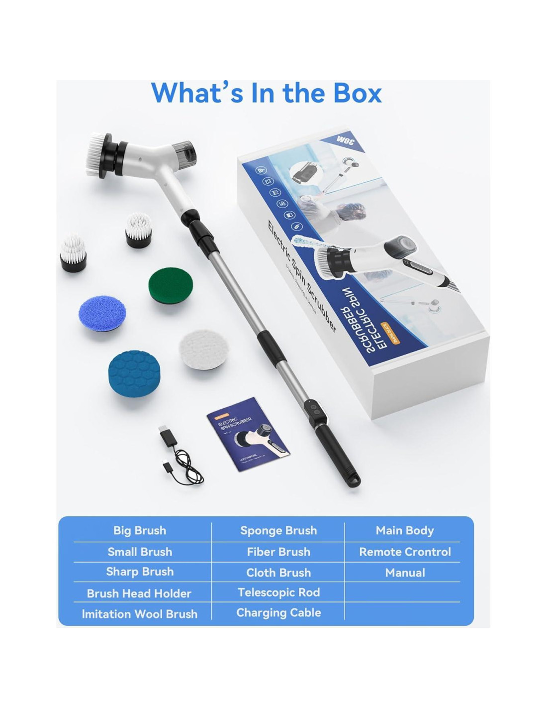 - [Kit Completo - Todo lo que Necesitas en Una Caja] Incluye: cepillo eléctrico giratorio inalámbrico, 7 cabezales de cepillo, tanque de espuma de spray incorporado, cargador USB-C, mango de metal largo, manual local y un control remoto práctico. Desde cepillo de ducha hasta cepillo de azulejos con mango largo, es una solución de grado profesional para tu baño.