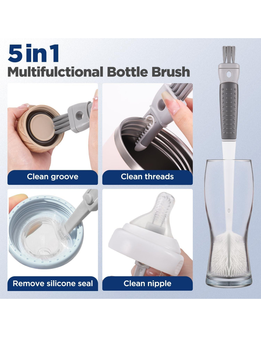 - [5-en-1 Multifuncional] Cepillo de limpieza de botellas desmontable, cepillo de ranura de silicona en forma de U, cepillo de alambre trenzado, cepillo de esquina rígido, herramienta para quitar sellos, limpia fácilmente tazas, tapas, ranuras, surcos, no se moverá mientras lavas, fuerte capacidad de limpieza.