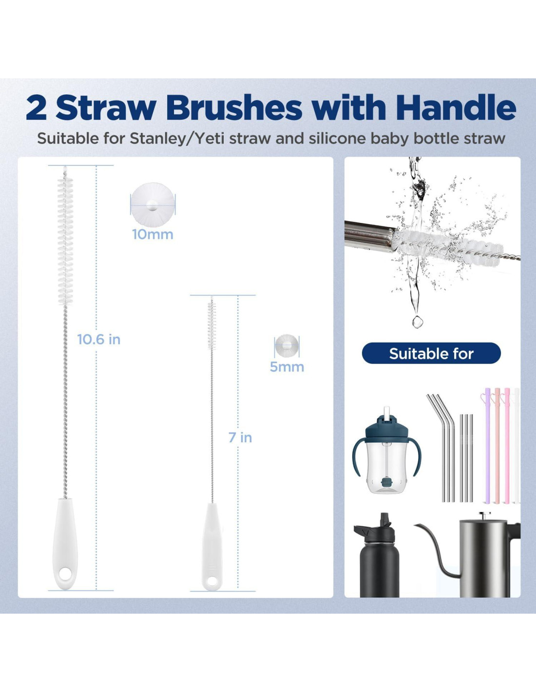 - [2 Cepillos para Popotes con Mango] Cepillo de popote de 27.9 cm de largo utilizado para popotes reutilizables, como Stanley, SLM, Yeti. Cepillo de popote de 17.8 cm utilizado para popotes de silicona para biberones. Mango de alta calidad, más fácil de sostener mientras lavas.