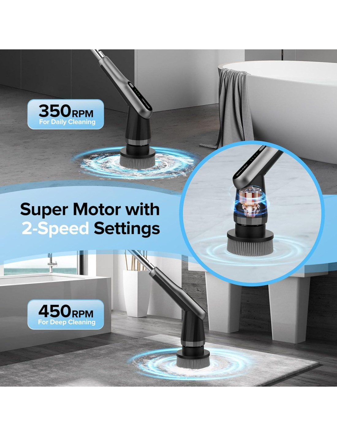 - [Rendimiento Potente y Duradero] Las mejoras en la batería y el motor cuentan con tecnología de celdas mejoradas y pasaron una prueba de rotación de 3600 horas, asegurando un par más fuerte y duradero. El material y la funcionalidad del mango extensible también han sido mejorados; simplemente presiona para ajustar la longitud. Ahora más robusto y conveniente, es el cepillo de ducha ideal con mango largo.