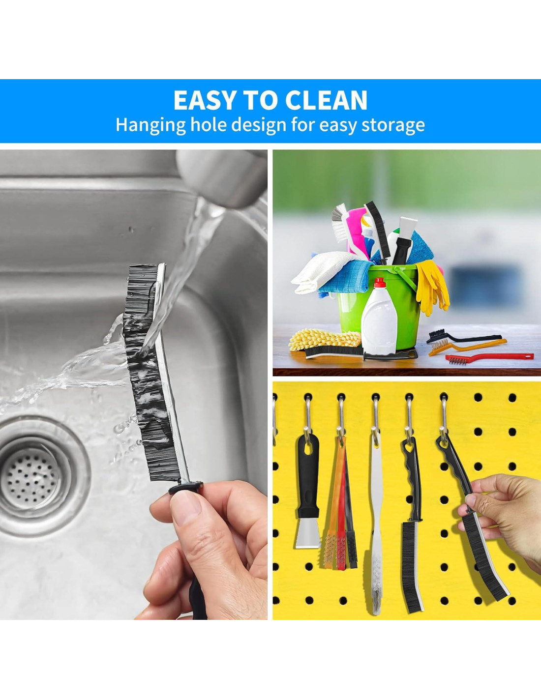 - Diseño Ergonómico: Los mangos de los cepillos y el raspador están diseñados ergonómicamente para un agarre cómodo, haciendo que la limpieza sea más eficiente y menos cansada. El diseño en ángulo de las cerdas y el raspador mejora la conveniencia y efectividad. Cada herramienta tiene un espacio para colgar en la cola para un fácil almacenamiento.