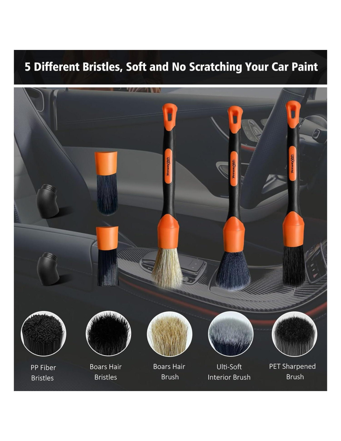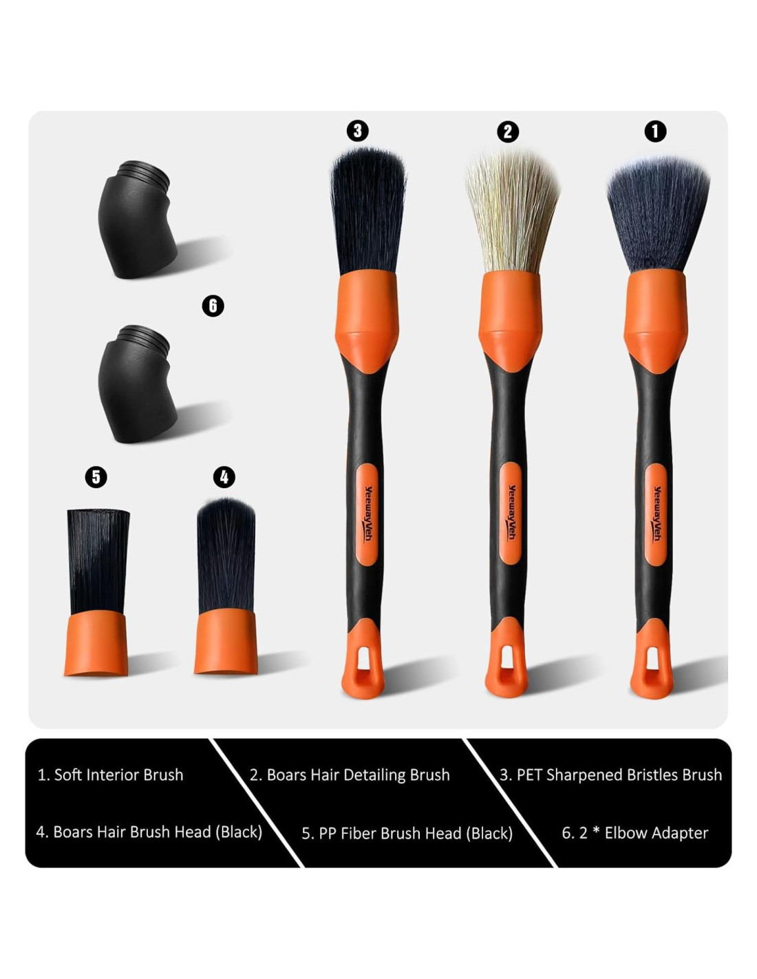 - Juego de Cepillos de Detalle Especializado: Juego de Cepillos de Detalle YeewayVeh con 5 cerdas diferentes que son suaves con las superficies pero altamente efectivas para limpiar la suciedad y los dos codos de conexión están diseñados especialmente para limpiar fácilmente grietas y esquinas de difícil acceso.