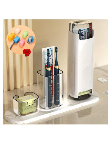 - DISEÑO ESPECIAL: Este soporte para cepillos de dientes cuenta con un diseño desmontable, combinando almacenamiento y necesidades de tocador en uno. Tiene dos compartimentos para organización, con áreas secas y húmedas separadas. Además, hay una sección inferior para almacenar toallas comprimidas, almohadillas de maquillaje y más.