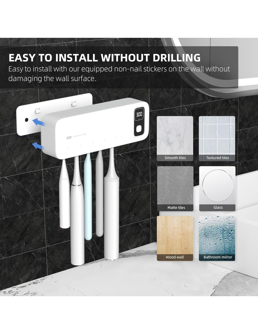 - Fácil de instalar y usar: Simplemente quita la película adhesiva e instala el soporte para cepillos de dientes en una superficie lisa y plana. Es muy conveniente quitarlo directamente al cargar, no se requiere fuente de alimentación externa ni perforación.