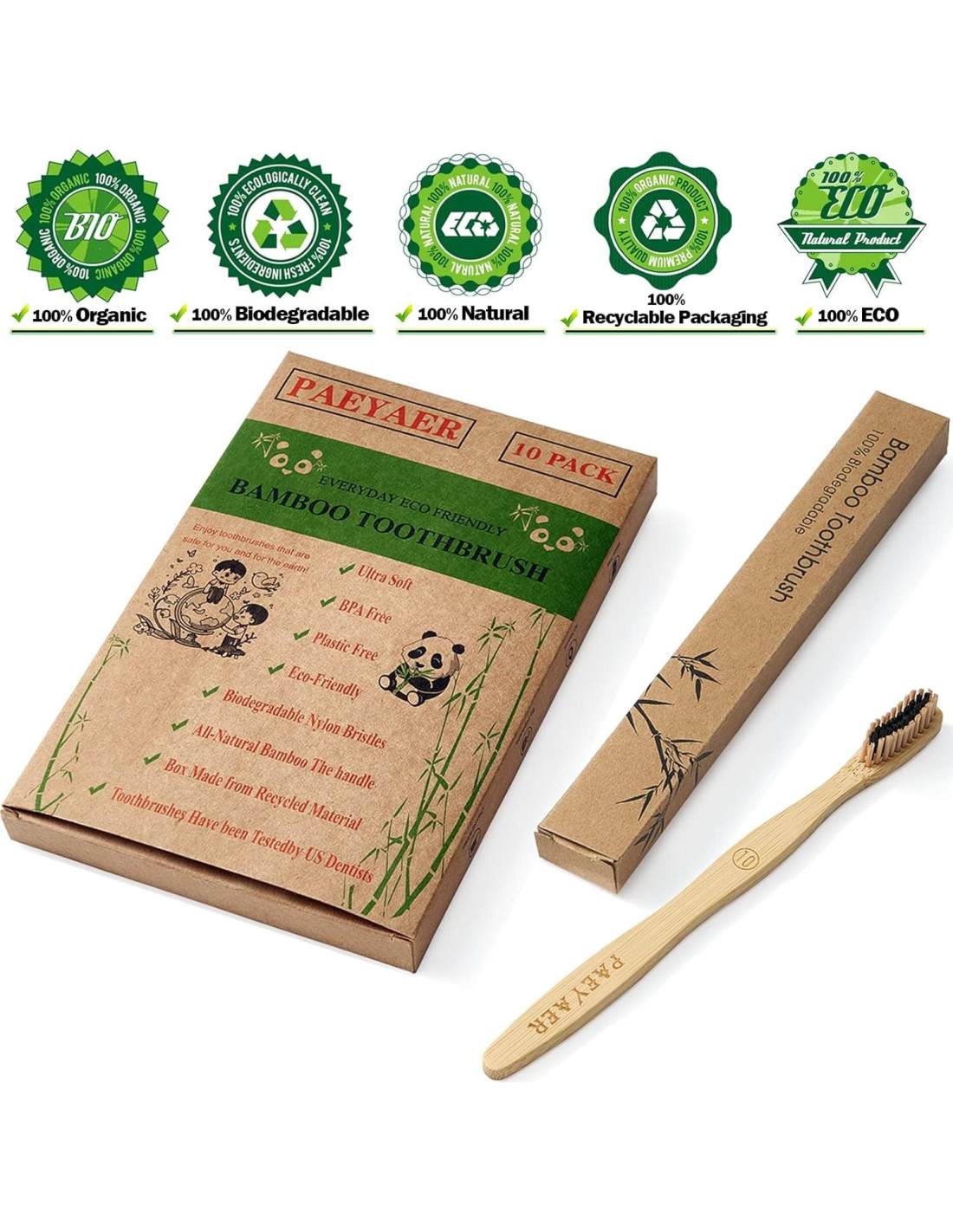 - Ecológico - Nuestros Cepillos de Dientes de Bambú están hechos de bambú natural y sostenible. Tienen la misma calidad que los cepillos de plástico regulares pero son completamente reciclables. Nuestro embalaje también es 100% reciclable.