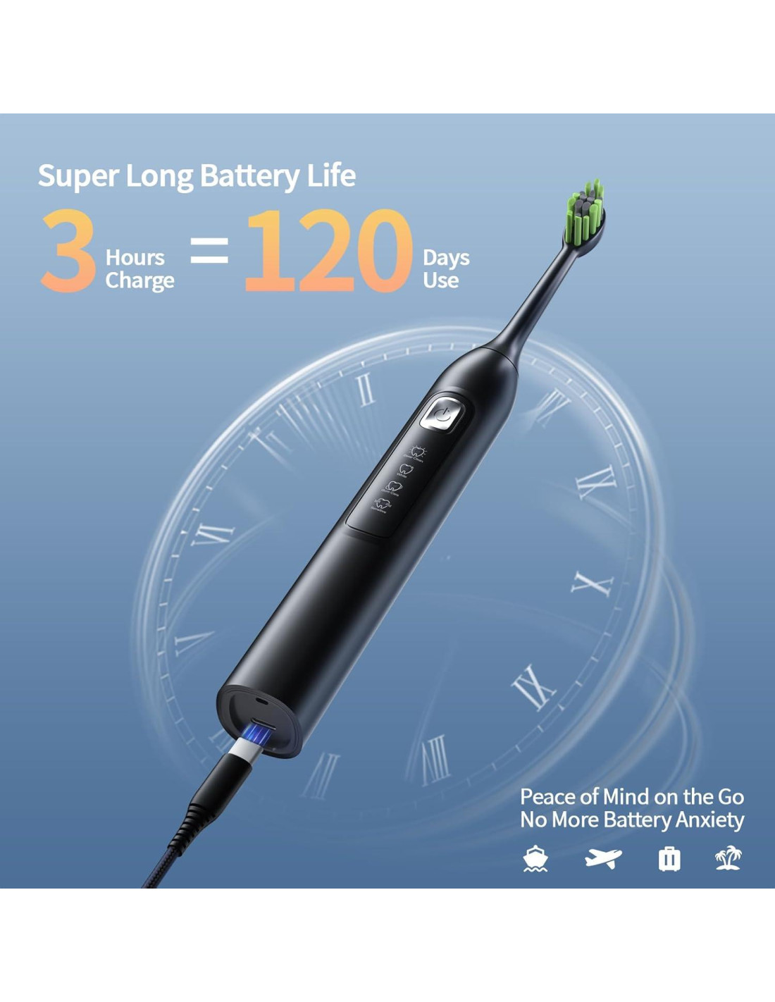 - 120 Días de Larga Duración de Batería, IPX7 a Prueba de Agua: El cepillo sonic tiene una excelente duración de batería y puede ser utilizado durante hasta 120 días con una carga de 3 horas, lo que lo hace muy conveniente para llevar en viajes de negocios o de vacaciones. Además, toda la máquina es IPX7 a prueba de agua, puedes usarlo de manera segura en la bañera y la ducha.