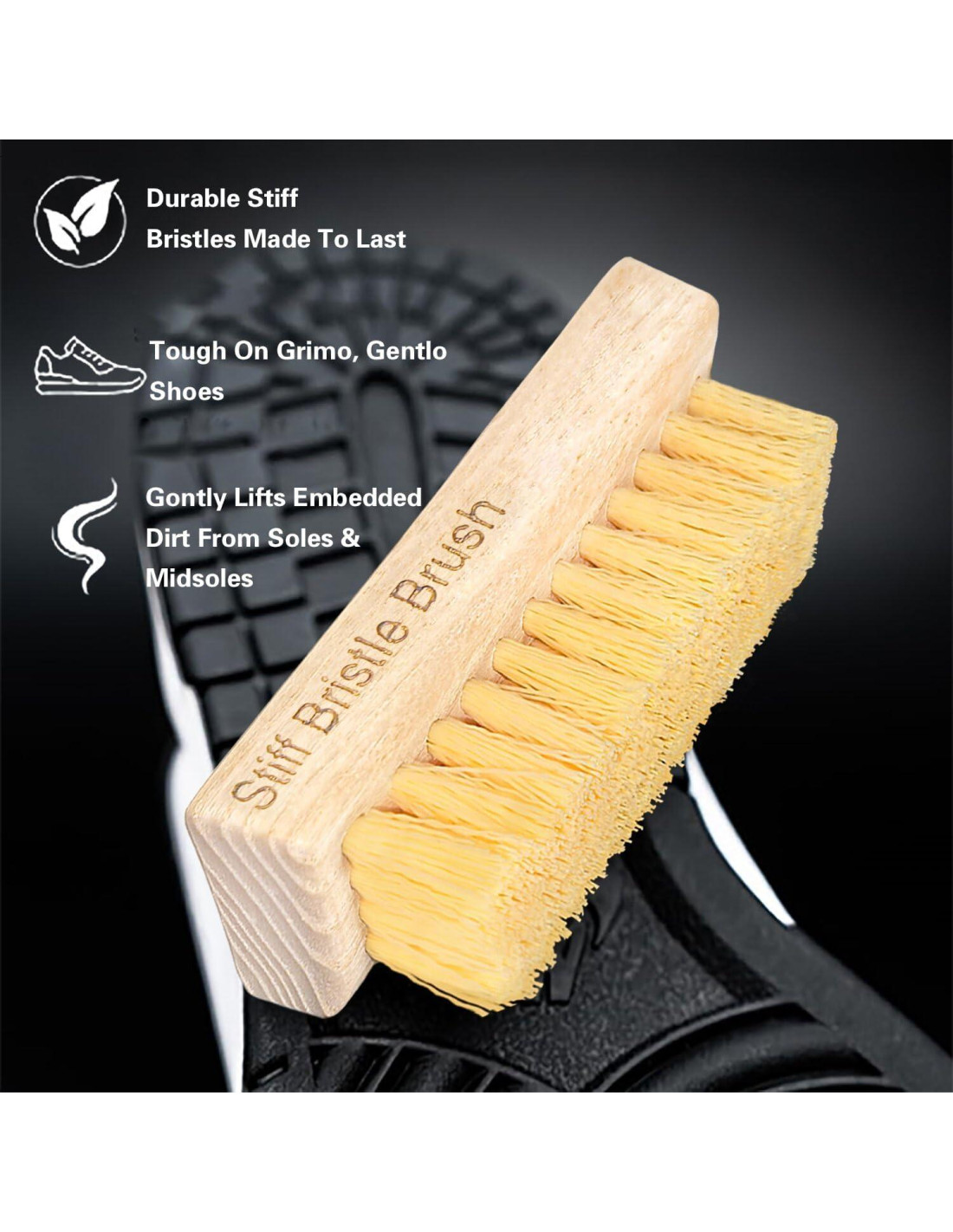 - ¡Las herramientas adecuadas para el trabajo! - Limpia las partes superiores, la lengua, la plantilla y el forro con el cepillo de cerdas suaves y el cepillo de cerdas rígidas está diseñado específicamente para medias suelas y suelas exteriores. Las cerdas de nylon rígidas son lo suficientemente largas como para alcanzar entre los tacos de las suelas de las botas, eliminando efectivamente la tierra seca.