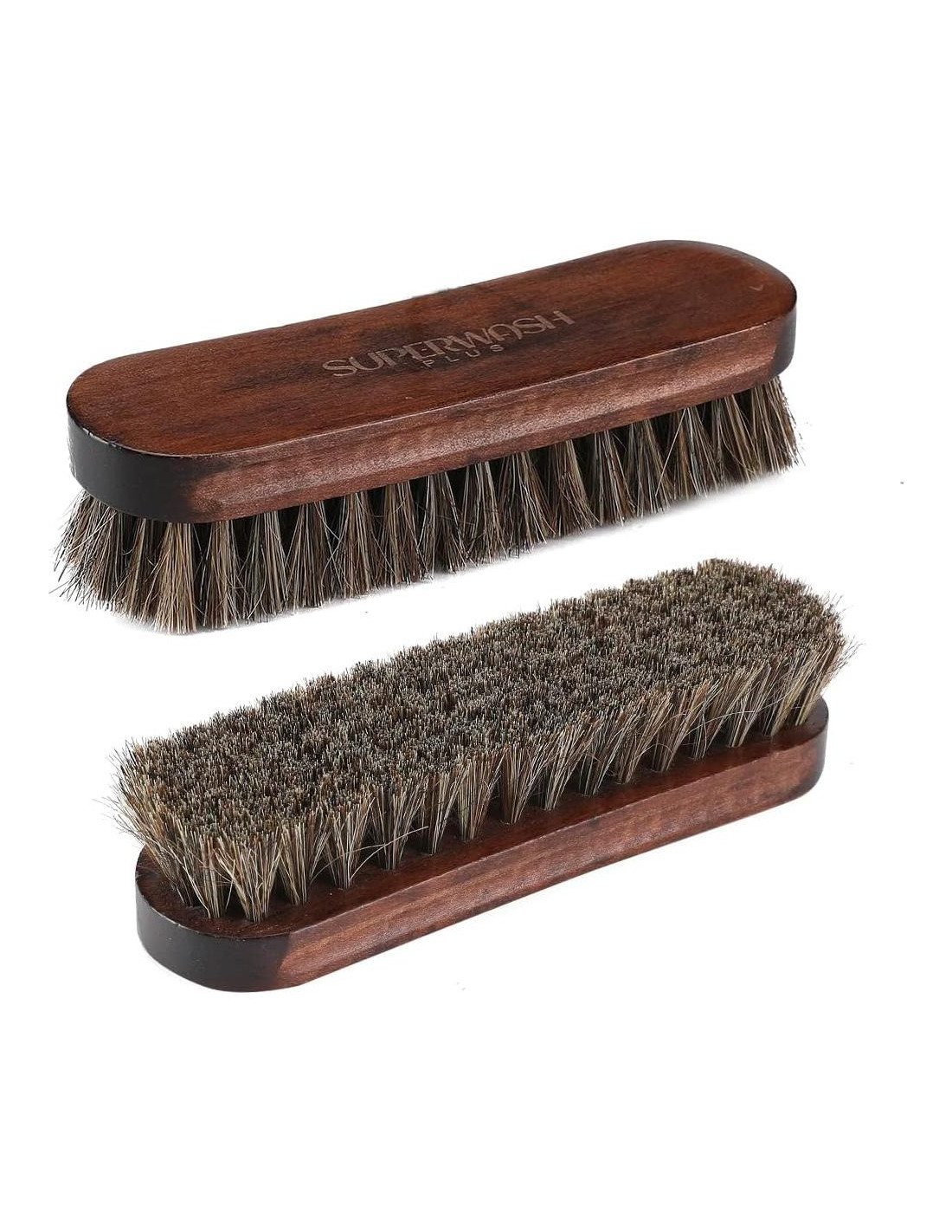 El kit de cepillos para brillar zapatos SUPERWASH PLUS proporciona un nivel profesional de calidad en el cuidado diario de tus zapatos y la limpieza del cuero. No te arrepentirás si sabes cómo abrillantar tus zapatos. Usa el más pequeño para aplicar la crema, usa el más grande para abrillantar. Los cepillos están hechos de mangos de madera sólida, con agarre ergonómico y cerdas genuinas de pelo de caballo, están en el nivel perfecto de rigidez para trabajar para tu propósito. Estos cepillos son muy efectivos para limpiar y pulir cueros, pero sin ningún rasguño o daño. El aplicador de crema de mango largo tiene una concentración de cerdas de pelo de caballo en la cabeza redonda, es ideal para aplicar uniformemente crema, cera y pulimento en los zapatos de cuero. También funciona muy bien para limpiar y quitar el polvo de pequeños rincones, costuras y áreas estrechas. El cepillo grande rectangular para brillar zapatos es ideal para una limpieza rápida y pulido, creará un bonito acabado brillante para ti. Este juego de cepillos para brillar zapatos es una combinación perfecta para ayudarte a mantener los zapatos de cuero con un brillo fantástico. Además de los zapatos y botas de cuero, los cepillos también se pueden usar en tapicería y todos los demás productos de cuero, como sofás, chaquetas, billeteras, bolsos y cinturones. Si estás buscando un cepillo de buena calidad para cuidar tus zapatos y botas, por favor prueba usar los cepillos para zapatos SUPERWASH PLUS. Estos harán un gran trabajo de quitar el polvo o abrillantar todos tus tipos de zapatos de cuero, botas, abrigos y bolsos.